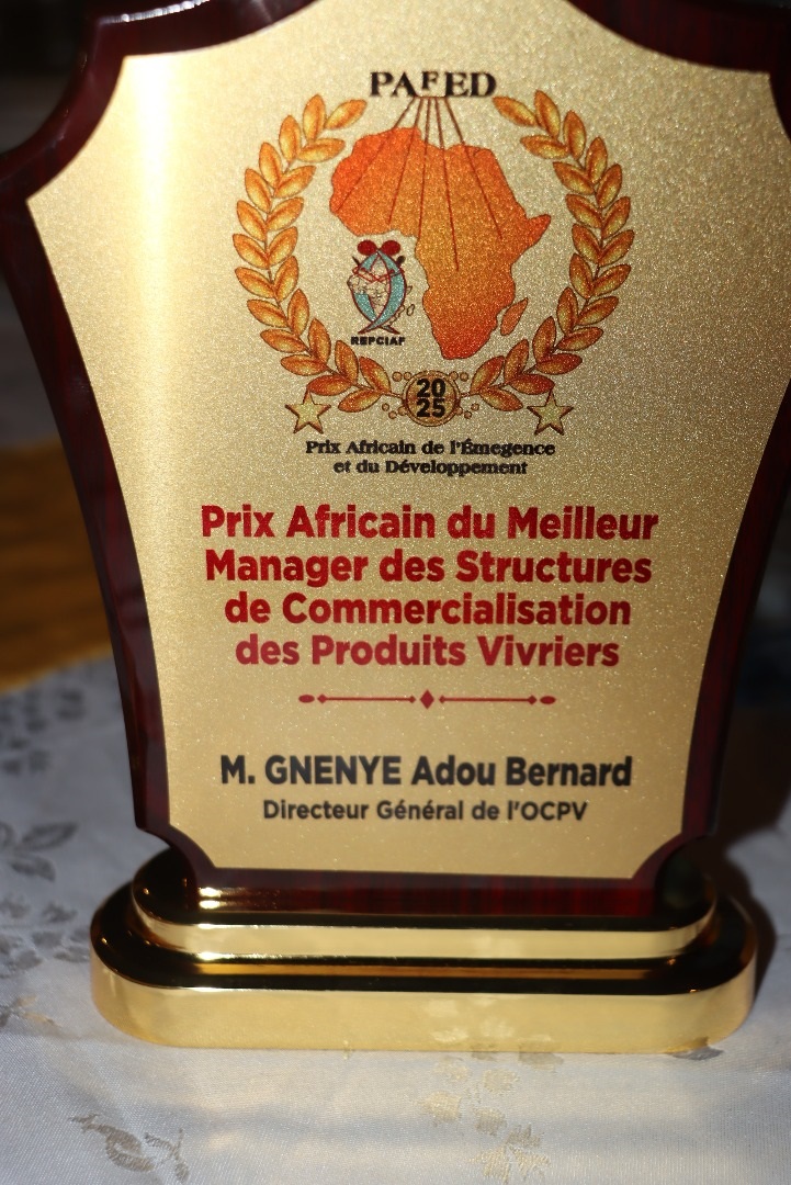 Ce Samedi 30 août 2025, Le Directeur Général de L'OCPV, M. GNENYE Adou Bernard a été honoré au titre du PRIX AFRICAIN DU MEILLEUR MANAGER DES STRUCTURES DE COMMERCIALISATION DES PRODUITS VIVRIERS à L'hôtel Haliat Parc de Yamoussoukro.
